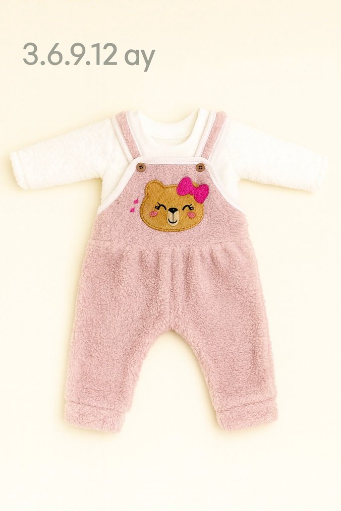 Pastel pembe renkli, örgü dokulu, nakış detaylı bebek tulumu. 3, 6, 9, 12 aylık beden seçenekleri mevcuttur.