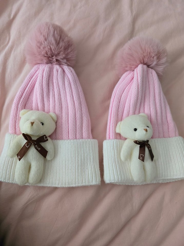 Nakışlı ayıcık ve yumuşak ponpon detaylı, beyaz manşetli, pembe pastel örgü çocuk bere. Trendy casual sokak stili için uygun.