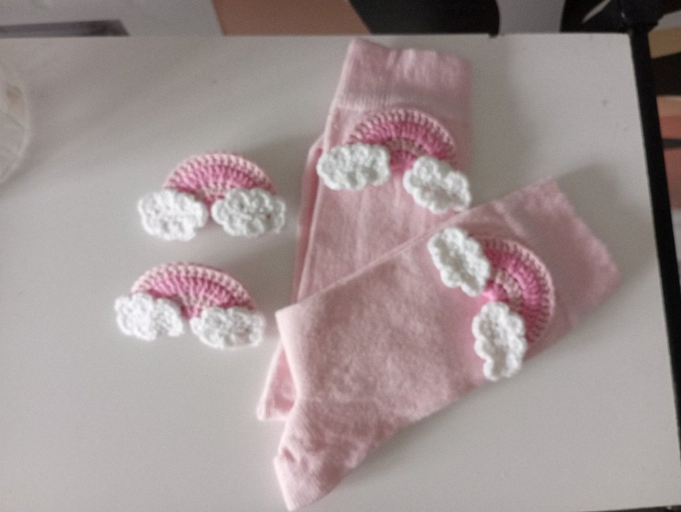 Yumuşak pembe örgü çocuk saç bantları ve tokaları, nakışlı pastel gökkuşakları ve bulutlarla bohem ve retro tarzını yansıtıyor.