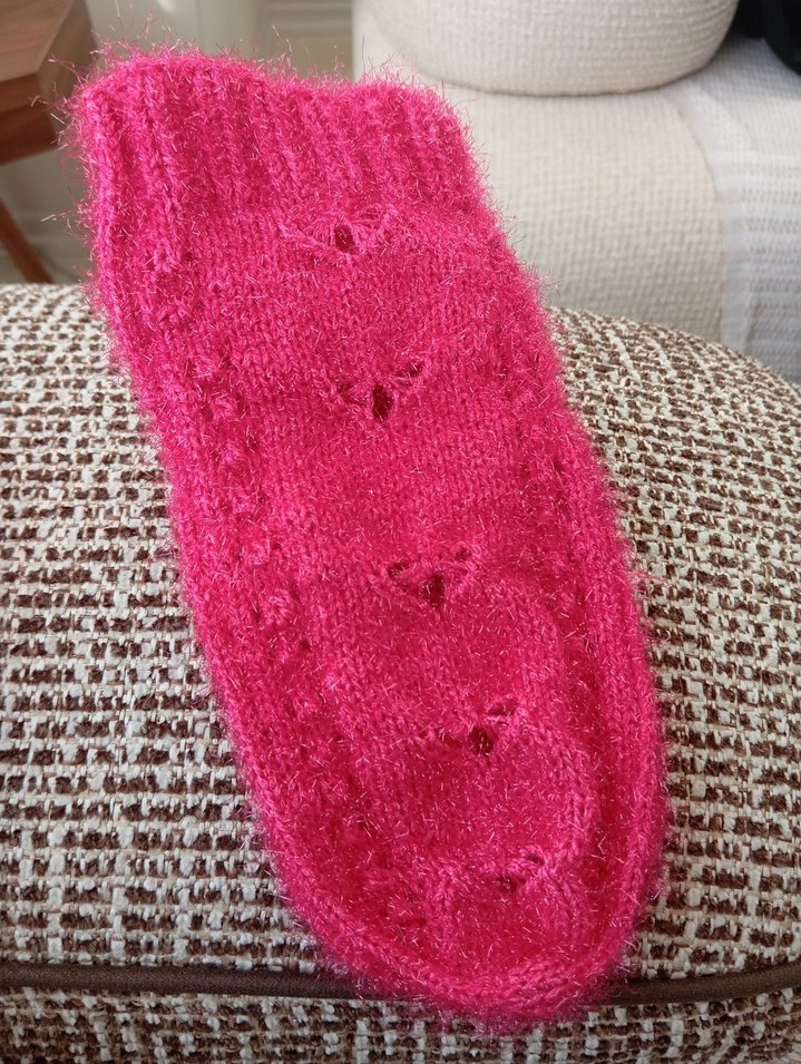 Yumuşak örgüden yapılmış, renkli nakış desenli pembe ev ayakkabısı. Konvansiyonel tarzda rahat ve sıcak tutar.