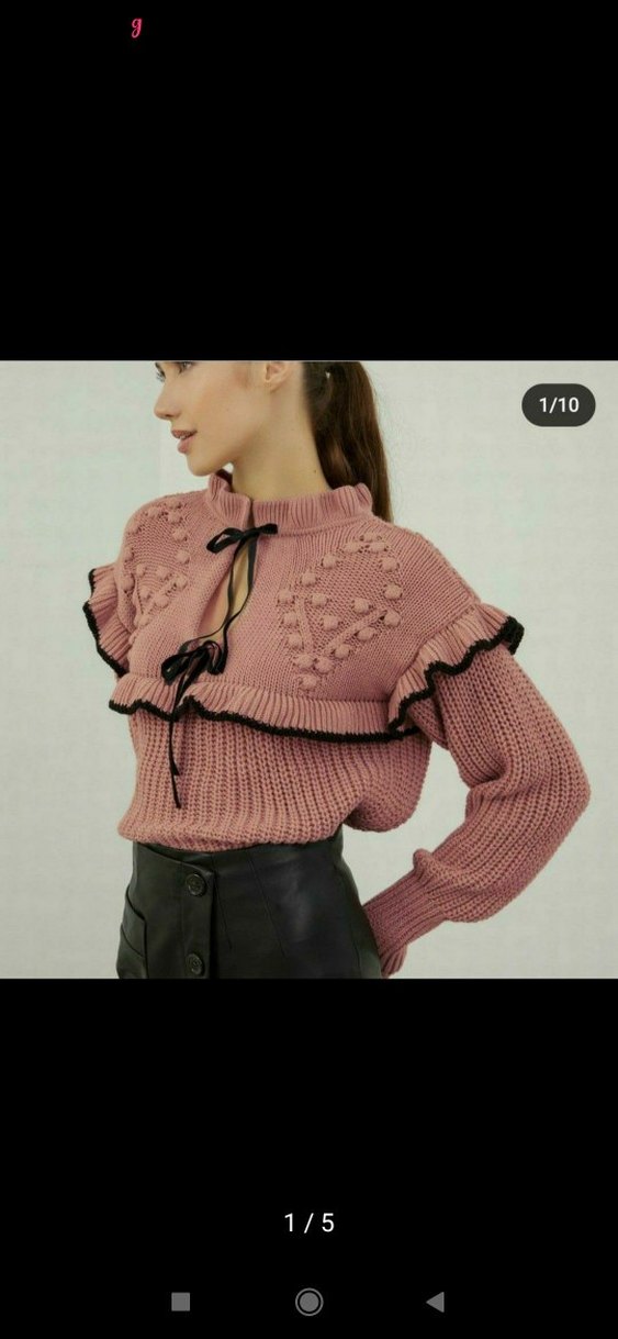 Pembe renkli, nakış detaylı ve siyah fırfırlı kenarlara sahip örgü kadın kazak. Salaş kesim, bisiklet yaka ve uzun kolludur. Trendy rahat stil için uygundur. BUTİK Ürünüdür