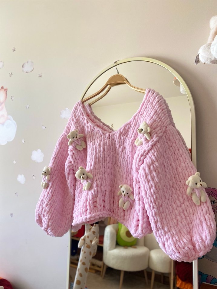 Pastel pembe renkli, uzun kollu, bol kesim örgü kadın kazak , nakışlı oyuncak ayı detaylarıyla rahat ve bohem tarz sunar.