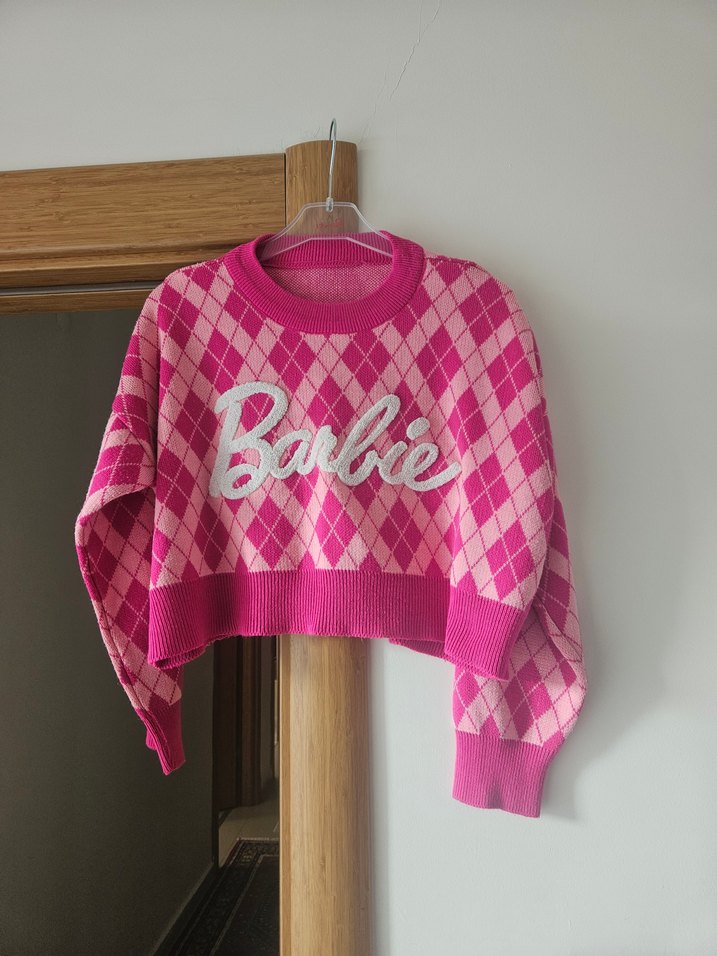 Pembe örgü kumaştan, uzun kollu, yuvarlak yakalı, nakışlı Barbie yazılı, bol kesim ve pastel argyle desenli kadın kazak. sadece 2 gun giyildi