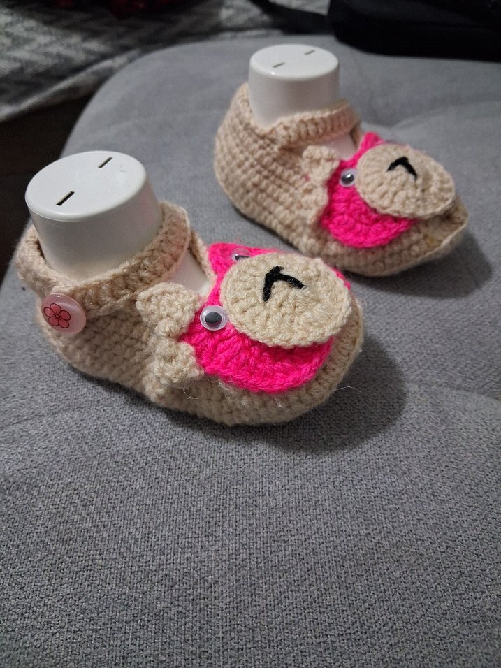Yumuşak örgü ipten yapılmış, renkli pembe nakış detaylı bohem tarzda kız bebek patikleri, sevimli hayvan yüzü tasarımıyla.