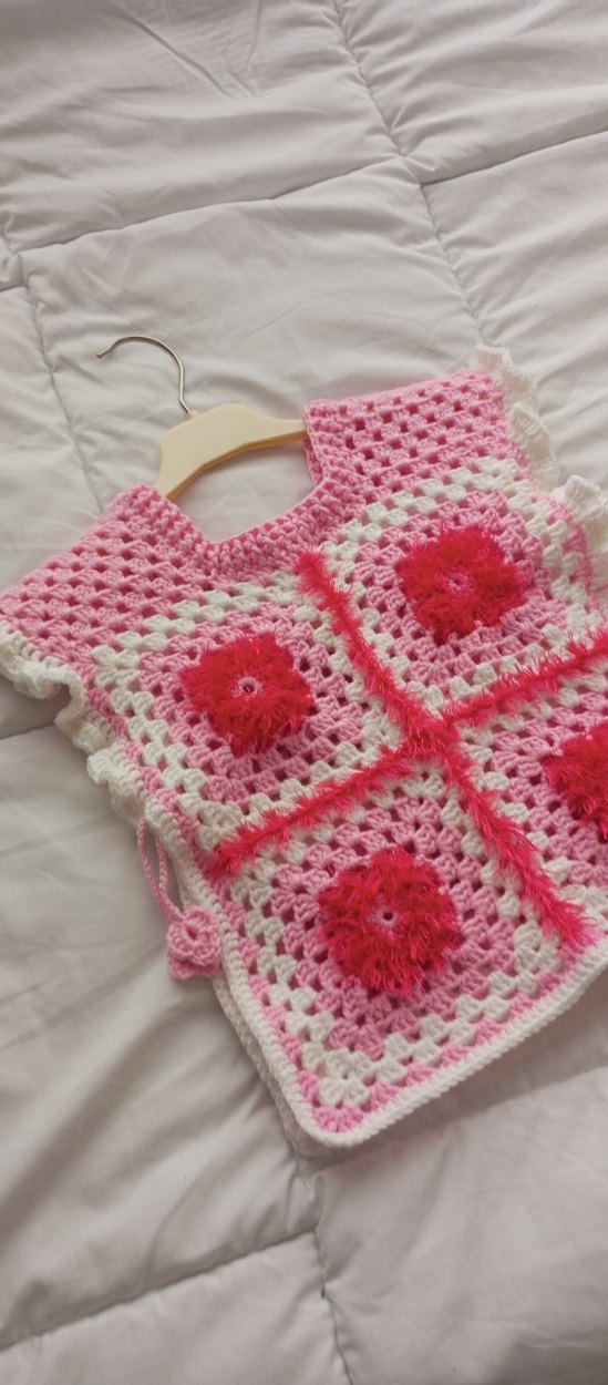 Bu kolsuz kız panço, bol kesim ve renkli nakışlı örgüden yapılmıştır. Bohem tarzda, yuvarlak yaka ve canlı pembe çiçek desenlerine sahiptir.
