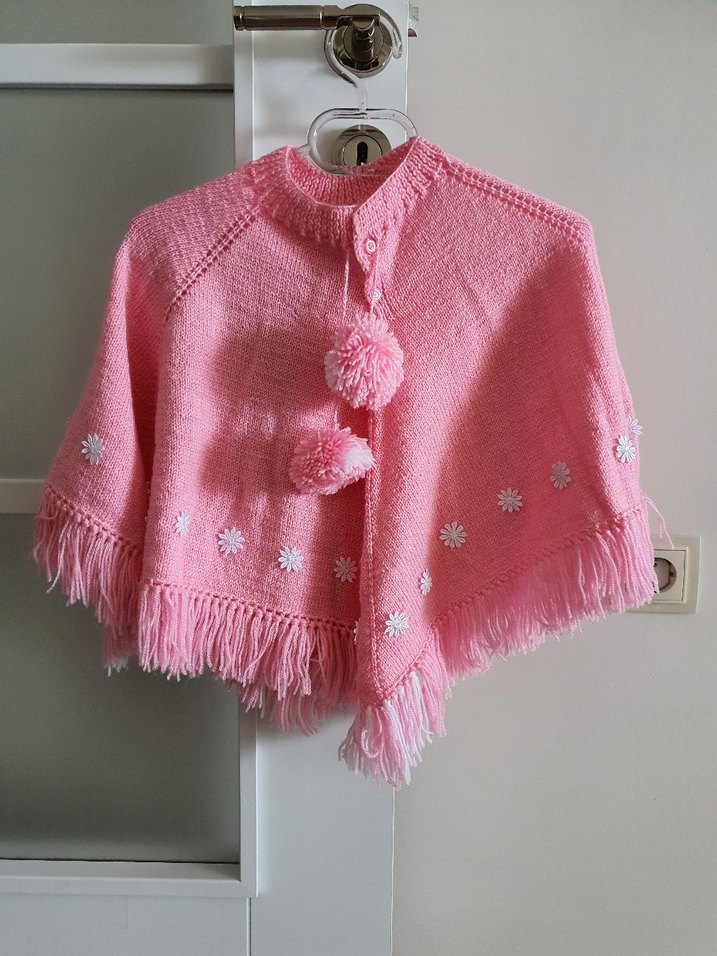Pembe renkli, nakış işlemeli, püsküllü kenarlara sahip örgü kız panço. Bohem tarzda, salaş kesimli ve askılı kolludur. yumuşacık bir örgüye sahiptir. el örgüsüdür.