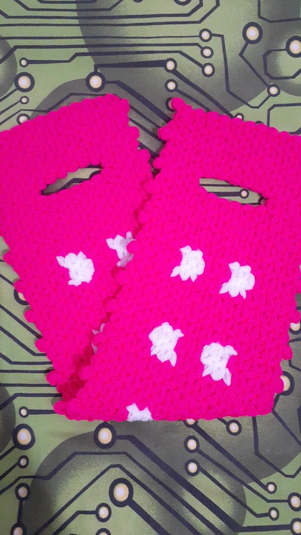 Pembe renkli, beyaz nakışlı desenlere sahip örgü kız eldivenleri renkli ve pop kültür tarzında, trend ve avangard bir görünüm sunar.