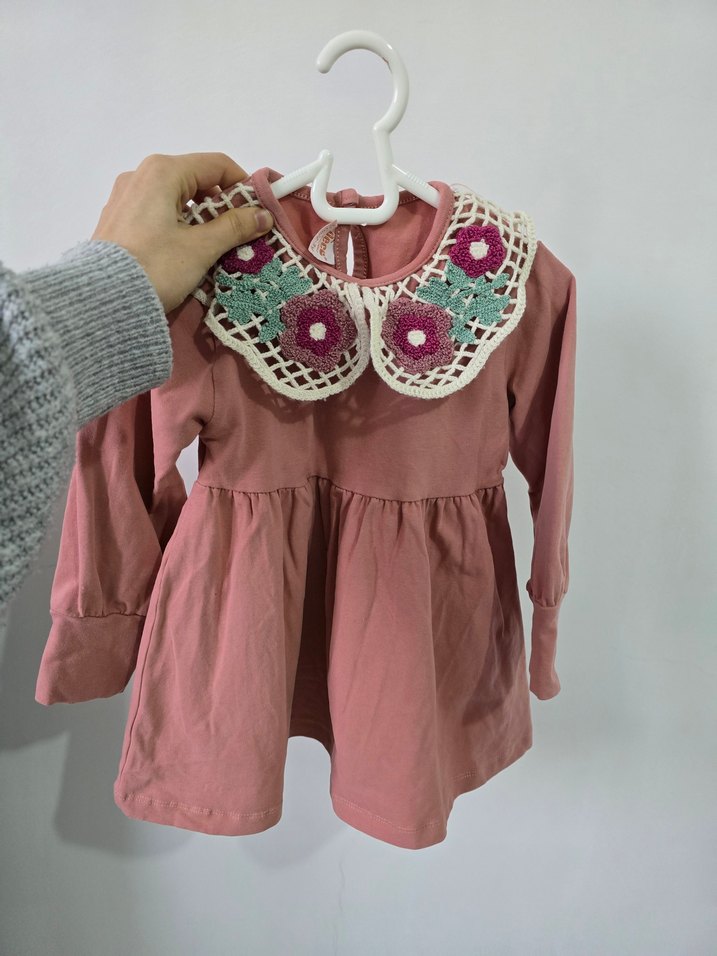 Pembe renkte, uzun kollu, bol kesim örme kumaştan kız elbisesi. Nakışlı çiçek desenli örgü yakasıyla bohem tarzı. çok az kullanıldı hiç bir sorunu yoktur