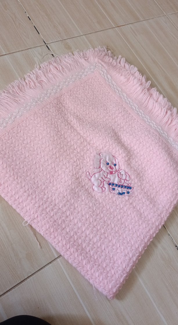 Püsküllü kenarları ve nakışlı köpek desenli, pastel pembe örme çocuk battaniyesi. Yumuşak ve rahat bir dokusu vardır.