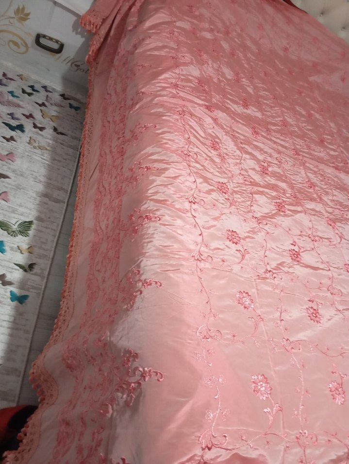Parlak pembe renkte, zarif nakışlı çiçek desenleriyle süslenmiş, yatak odasına yumuşak ve şık bir dokunuş katan yatak örtüsü. sfır ürün el yapımı