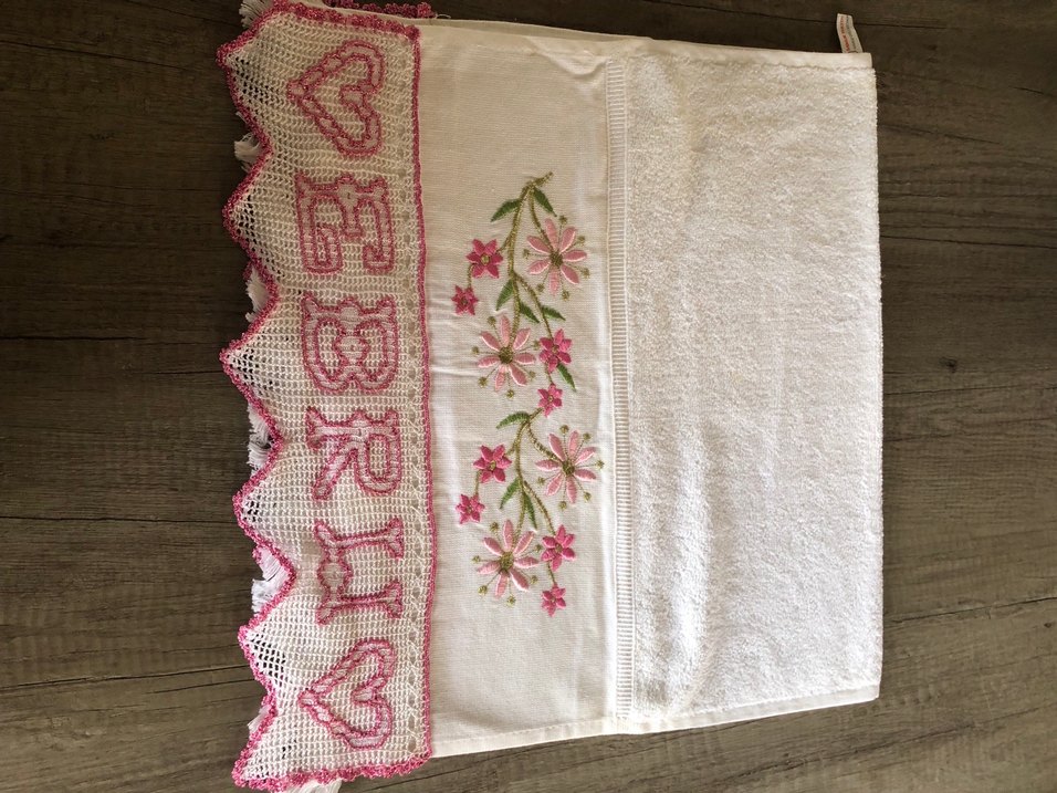 Bu pastel pembe havlu, çiçek ve kalp desenli geleneksel nakışlara sahiptir. İnce tığ işi ve nakış detaylarıyla tamamlanmıştır. Aynı isimdekiler alabilir…