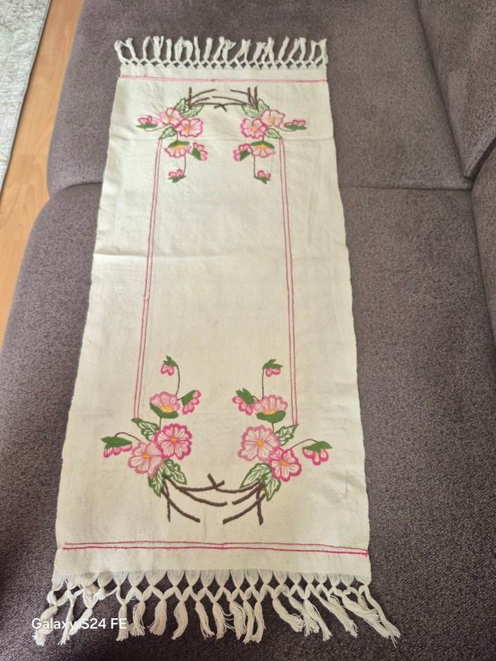 Pembe pastel renkli, nakışlı çiçek desenleri ve püsküllü kenarları olan geleneksel tarzda masa örtüsü. yörüklerden almıştım, el dokuma kumaş #runner