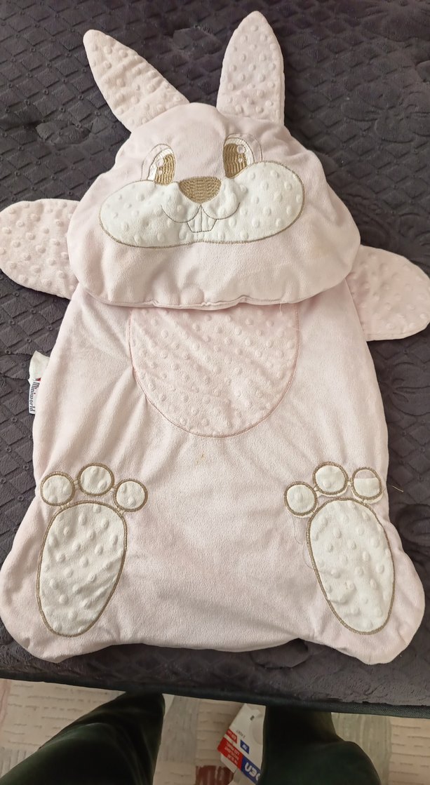 Pastel pembe renkte, nakış detaylı ve yumuşak, sıcak kumaştan yapılmış sevimli hayvan figürlü bebek uyku tulumu.