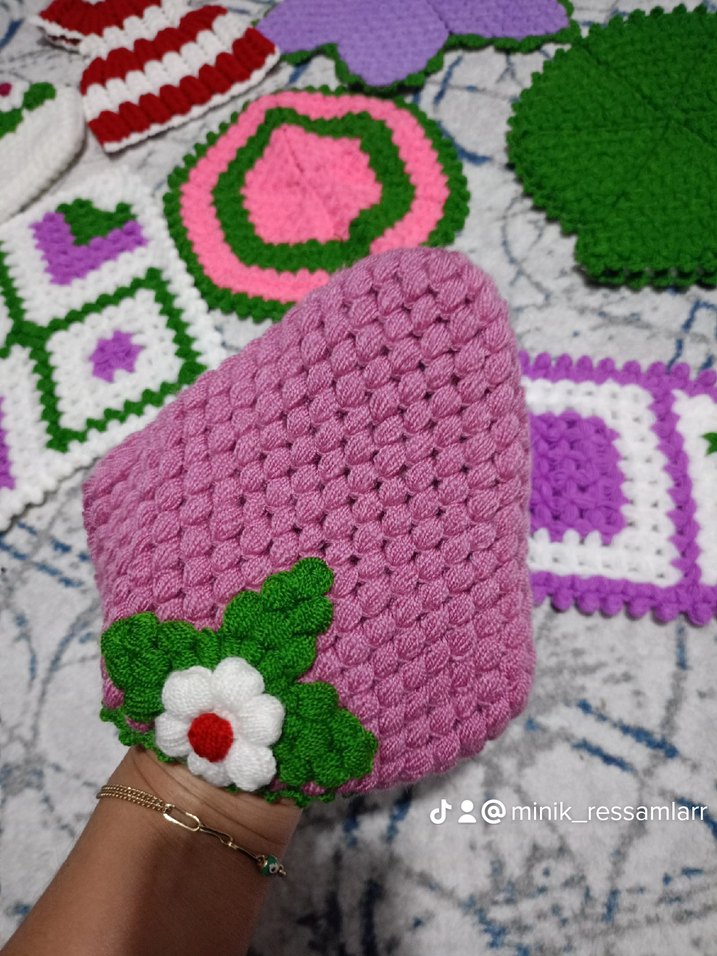 Pembe renkte, dokulu yapıya ve nakışlı çiçek detaylarına sahip renkli fırın eldiveni.
