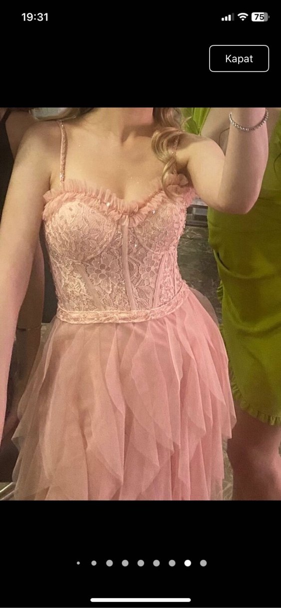 Nakış detaylı, straplez fırfırlı süslemelerle dikkat çeker. Pastel pembe renk ve bohem tarzıyla şık bir nişanlık. 1 defa kullandım nişandımda sorunsuz