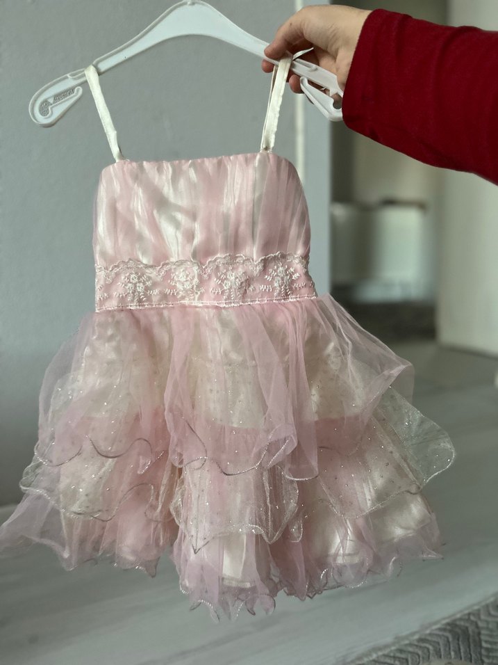 Pembe straplez kız elbisesi, nakışlı detaylar ve fırfırlı katmanlarla, yumuşak sentetik kumaştan üretilmiştir.