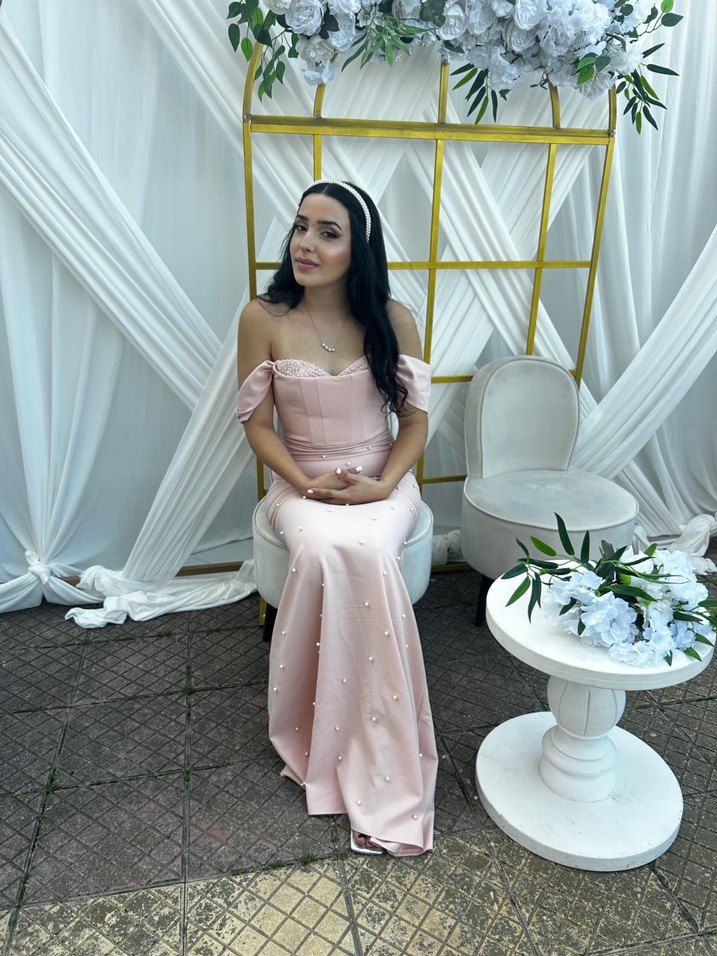 Pembe pastel tonlarda, straplez ve drapeli kollara sahip nakışlı uzun nişan elbisesi. Modern klasik tarzda, düzenli kesimle şıklık sunar.