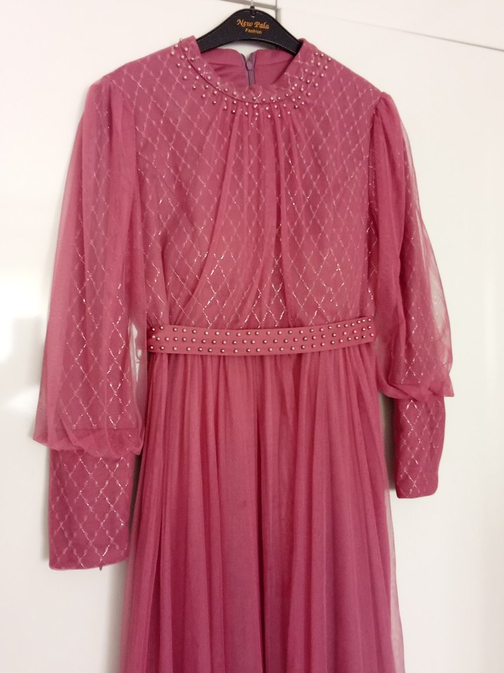 Nakışlı desenler, yüksek yakalı ve uzun kollu bu pembe uzun abiye elbise, bol kesim ve süslemeli kemer detayına sahiptir.
