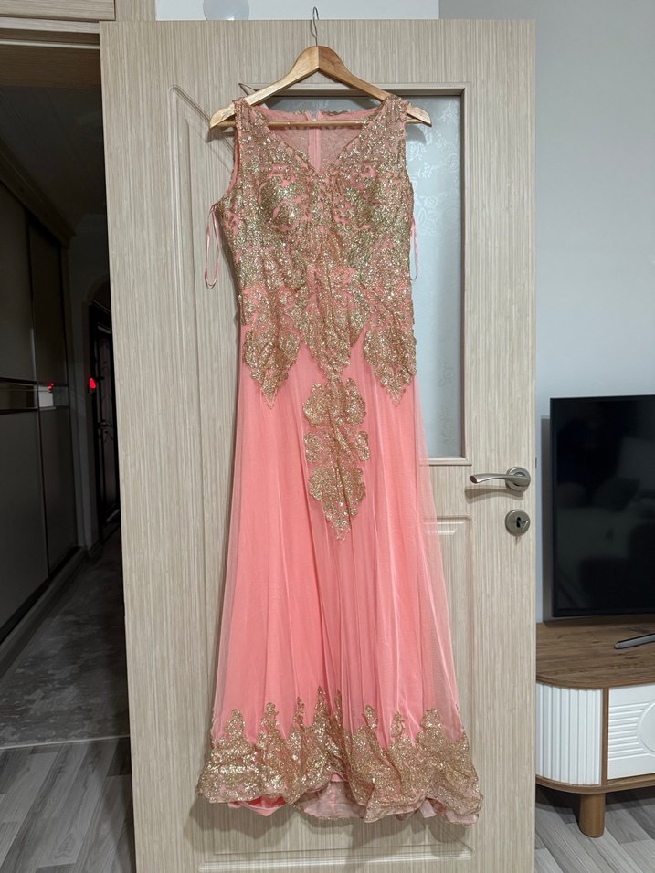 Pembe Nakışlı Uzun Abiye Elbise