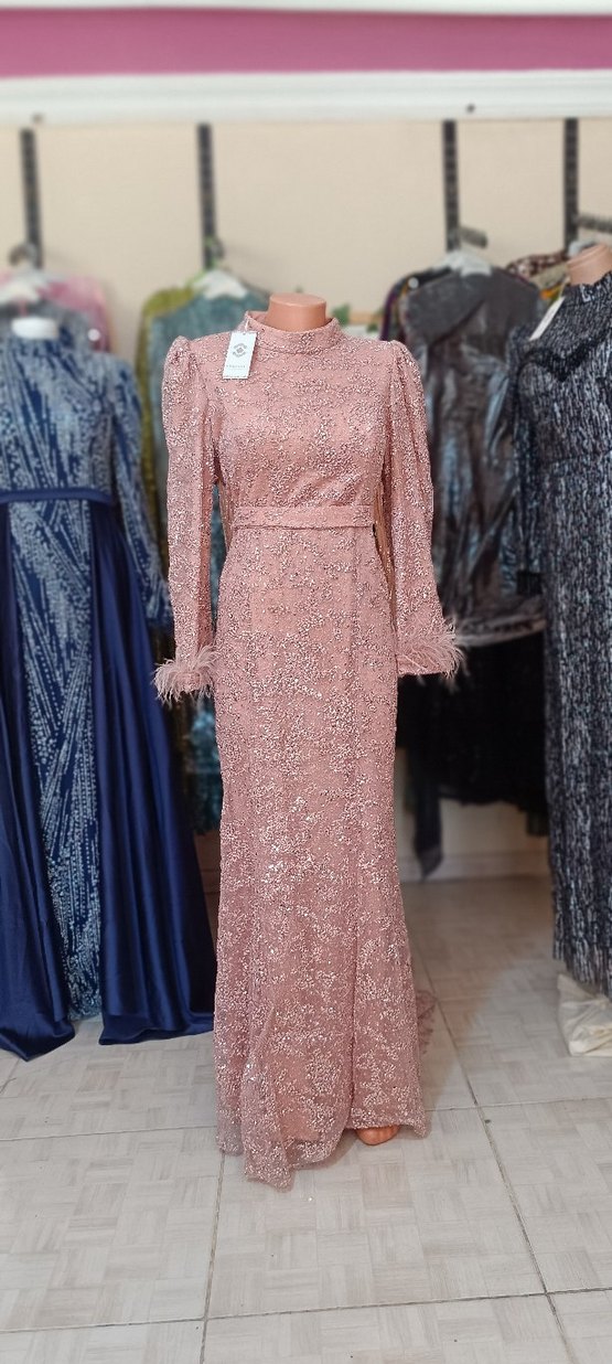 Pembe nakışlı uzun abiye, tüy detaylı uzun kollu ve yüksek yakalıdır. Klasik kesimi ve pastel tonlarıyla düğünlere uygun şık bir seçenektir.