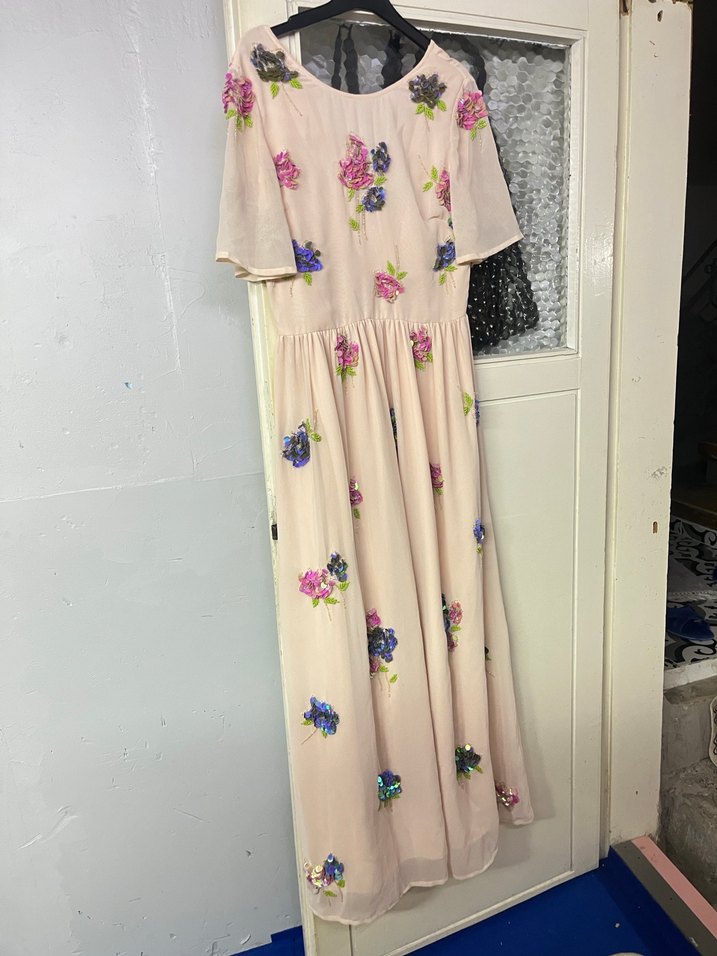 Pastel pembe uzun elbise, renkli çiçek nakışları ve dökümlü kısa kollu bol kesimiyle bohem düğün tarzına uygundur.