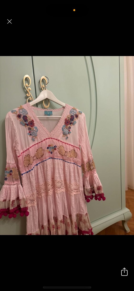 Pastel pembe renkte, nakışlı çiçek desenleri ve püsküllü kolları olan, V yaka, bol kesim uzun elbise. Günlük kullanım için bohem tarzda uygun. Hiç kullanılmamıştır butikden aldım