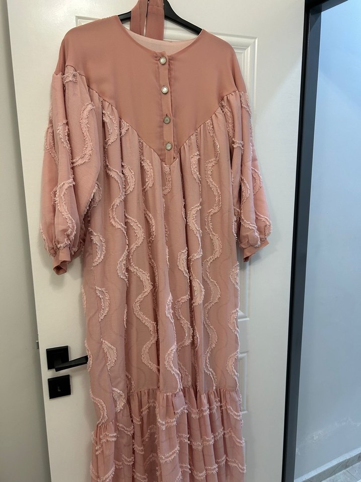 Bol kesim, pastel pembe renkli uzun elbise, nakışlı desenler ve fırfır detaylara sahiptir. 42 bedene kadar rahatlıkla olur. Boy 1.72 olarak giyilmiştir.