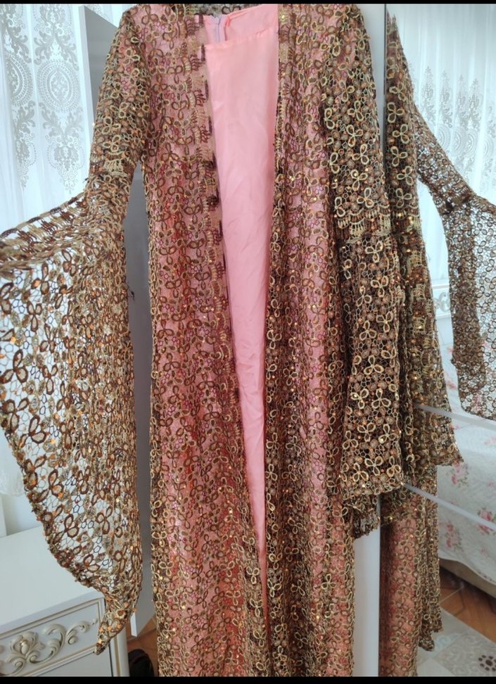 Pembe, parlak nakışlı kumaştan uzun, bol kesim kadın Hint elbisesi. Uzun kollu, straplez yakalı ve drapeli. Bohem, hippie, retro tarzda düğünlere uygun.