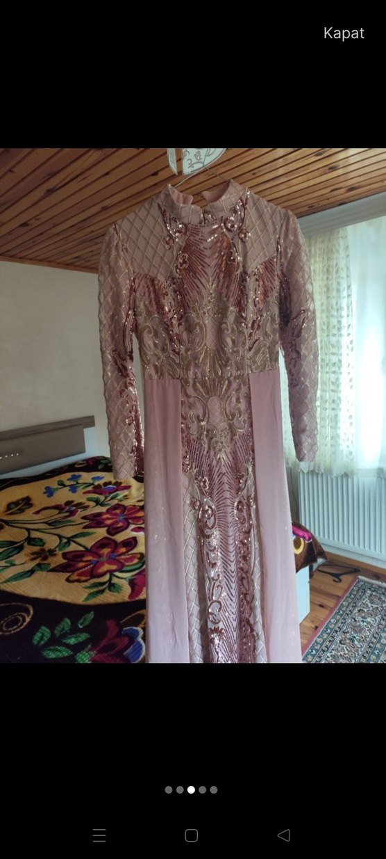 Pembe pastel tonlarında, yüksek yakalı ve uzun kollu, dantel ile işlenmiş detaylara sahip dar kesim uzun abiye elbisedir. Düğünler için uygundur. marka temsilidir