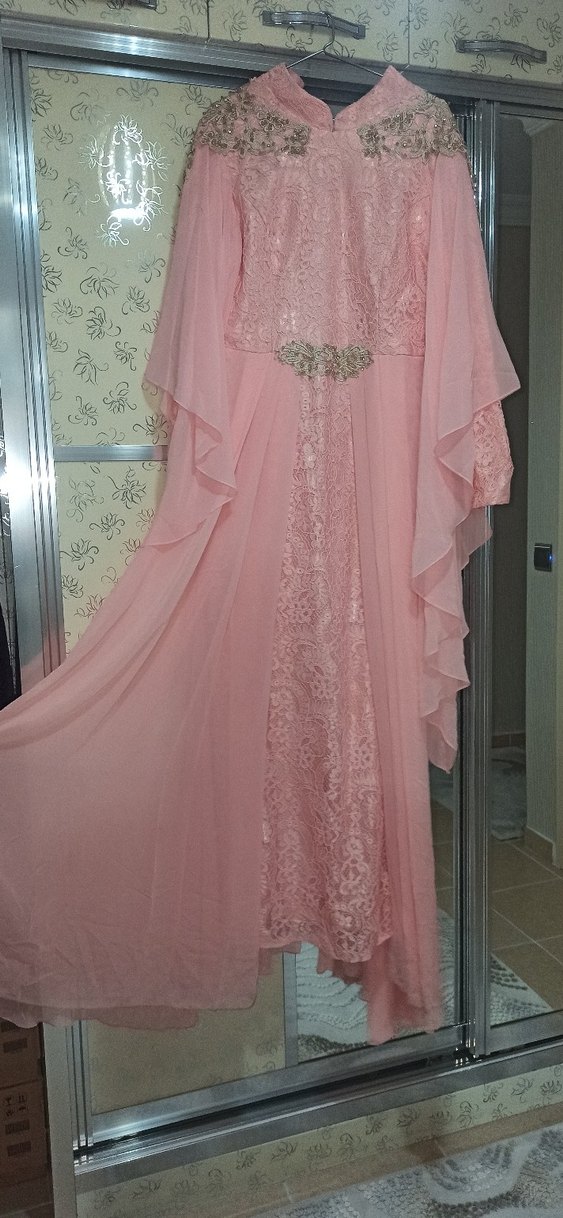 Pembe Nakışlı Uzun Drapeli tesettür Abiye Elbise