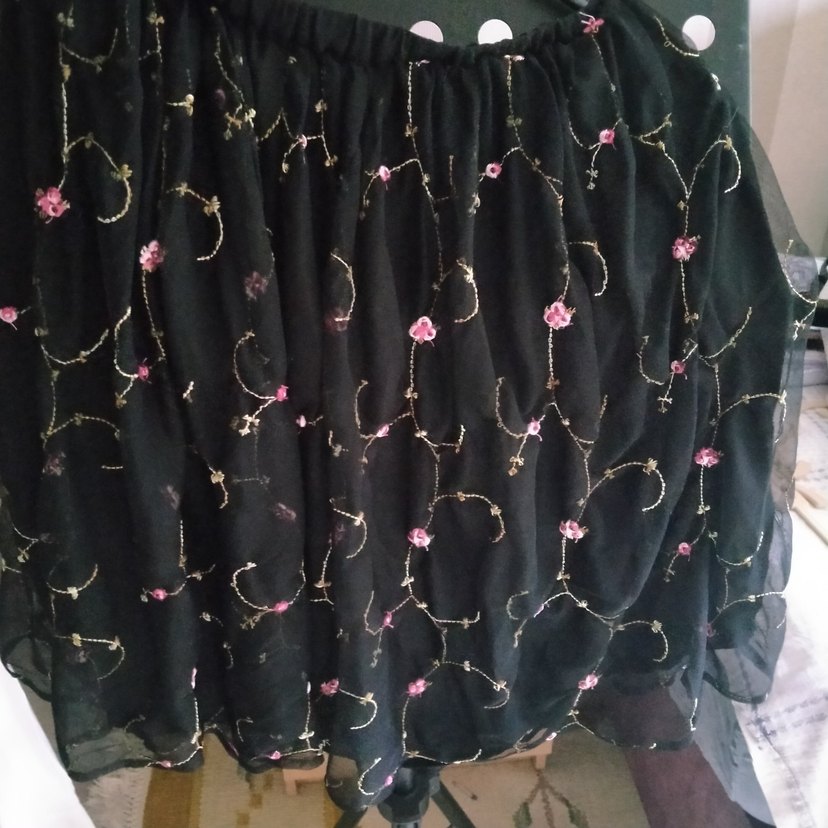 Bu koyu pembe hamile eteği, bol kesim ve drapeli tasarımıyla nakışlı çiçek desenleri içerir, gotik bohem parti tarzına uygundur.