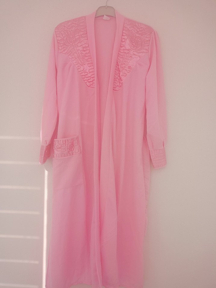 Uzun kol ve bol kesime sahip pembe sabahlık, minimal bohem tarzda ince nakışlarla süslenmiştir hiç kullanılmadı sıfır ürün#sabahlik#icgiyim