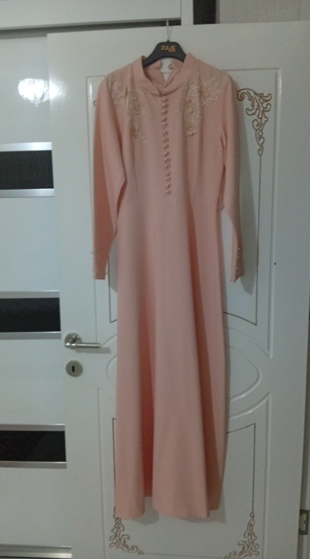 Pembe Nakışlı Uzun Kollu Abiye Elbise