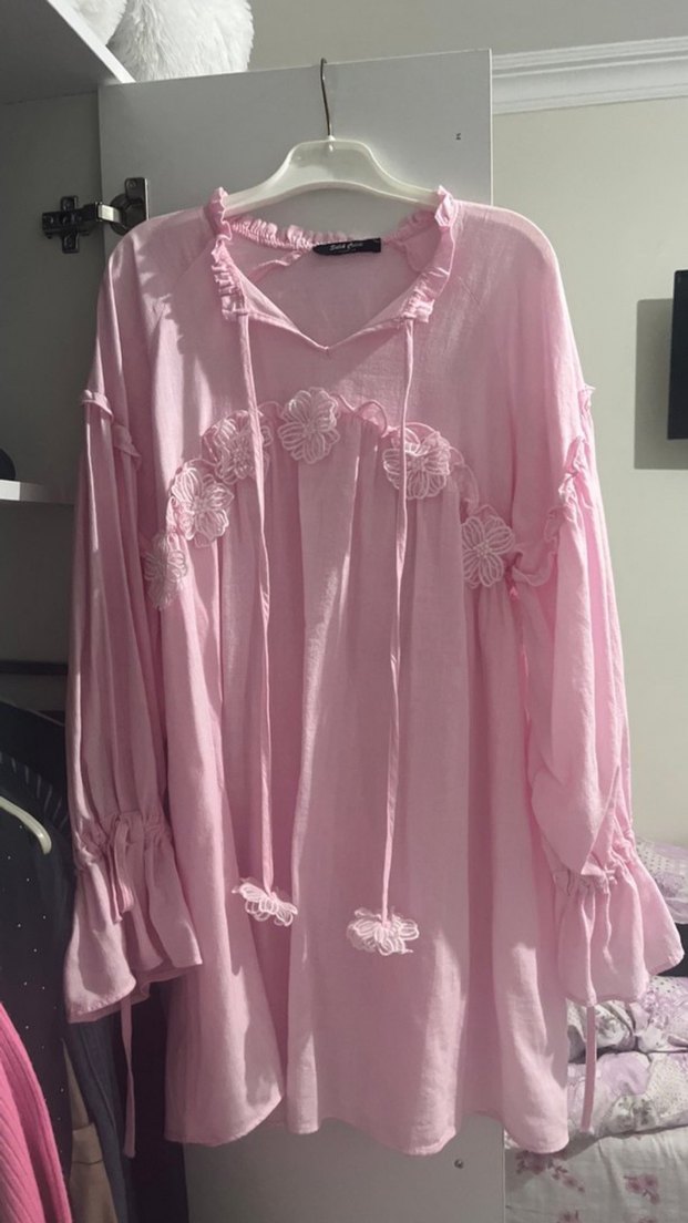 Yumuşak keten kumaştan, bol kesim pembe hamile bluzu. Uzun kollu, nakışlı ve fırfırlı detaylara sahip, V yaka tasarımlı bohem tarzı bluz. tertemiz 1 kere giyildi