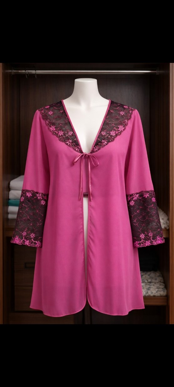 Uzun kollu ve uzun boylu, bol kesim pembe kadın sabahlık Kollar ve yakada nakış detaylarıyla bohem tarzı ve bağcıklı ön kapanış bulunur.