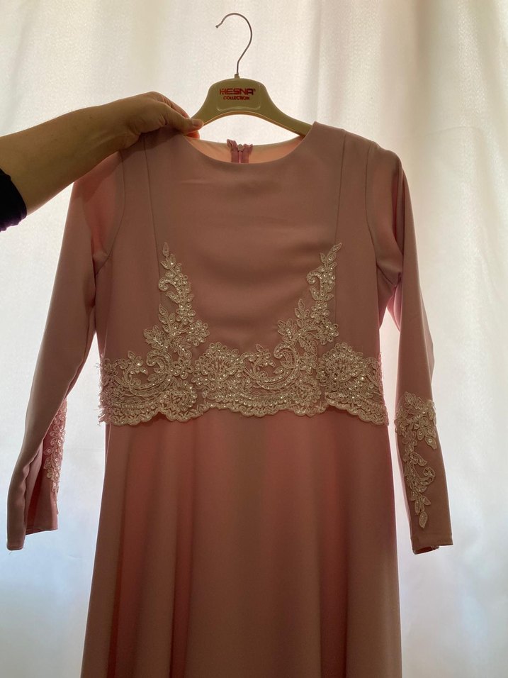 Fitted kesimli, uzun kollu, yuvarlak yaka ve drapeli tasarımlı, nakış detaylı pastel pembe renkte nişan elbisesi. Vintage ve modern klasik tarzı bir arada sunar. Ürün bir kez kullanıldı.