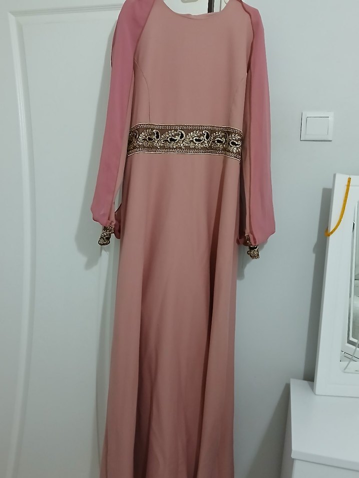 Pembe, uzun kollu ve kayık yaka kesime sahip bu elbise, belde nakış detaylarıyla süslenmiştir. Sentetik kumaştan, bol kesim ve vintage tarzda bir modeldir. yeni 1 kez düğüne giydim