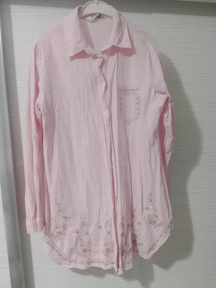 Pembe keten gömlek, uzun kollu, yakalı ve düğmeli. Nakış detayları ve bol kesimiyle günlük kullanıma uygun.