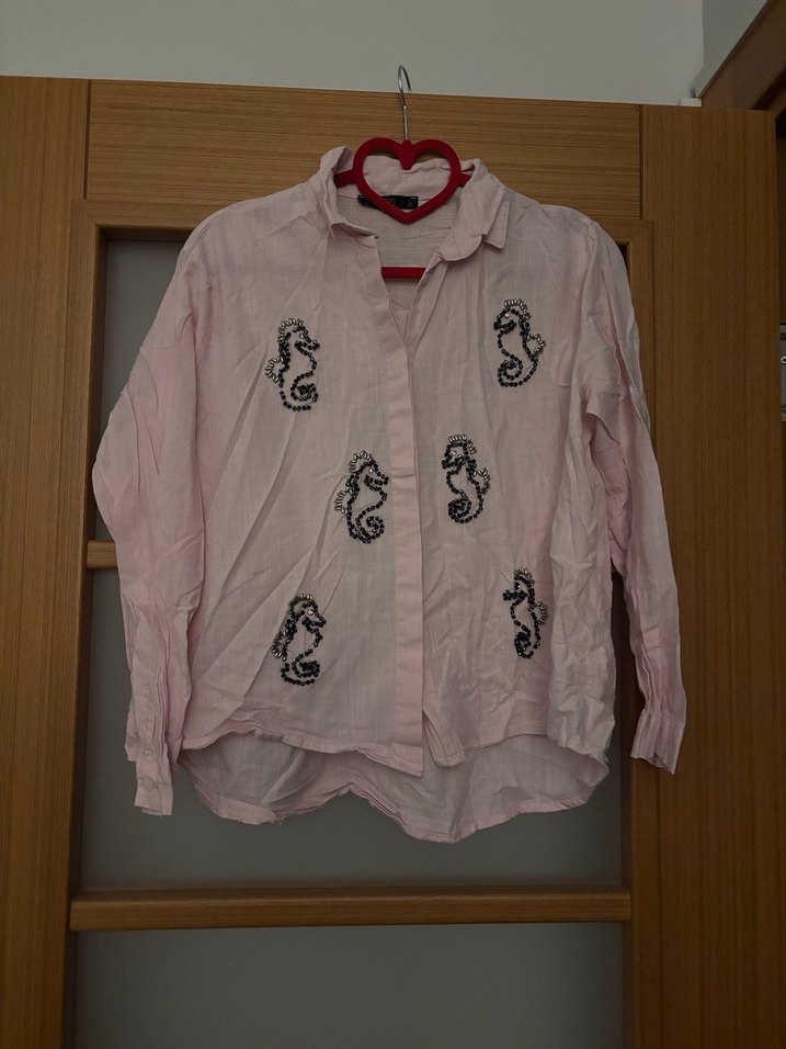 Pembe keten gömlek, uzun kollu ve yakalıdır. Düğmeli, nakışlı denizatı desenleriyle rahat ve salaş kesimdir.