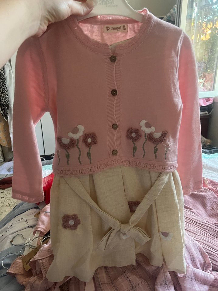 Düğmeli, uzun kollu ve fitted kesim kız elbisesi, yumuşak triko kumaştan yapılmıştır. Nakışlı çiçek desenleri ve pastel pembe renk ile bohem tarzda tasarlanmıştır. 4yaş ve 7 yaş