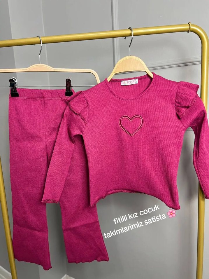 Pembe renkli, uzun kollu, nakış detaylı triko kız çocuk takımı, yumuşak ve rahat bir kullanım sunar.