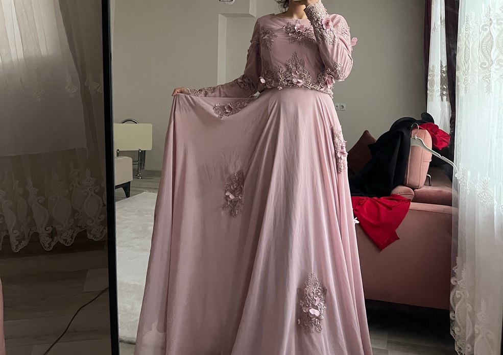 Pembe Nakışlı Uzun Kollu Uzun Abiye bir defa giyildi