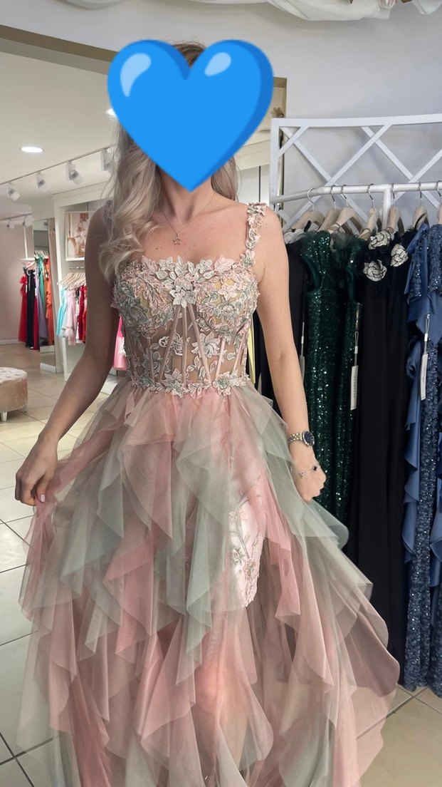 Nişan için tasarlanmış, straplez ve pembe tonlarında nakışlı, boncuk işlemeli uzun ve askılı elbise. Bohem tarzıyla katmanlı yapıya sahip, düğünler için uygundur.