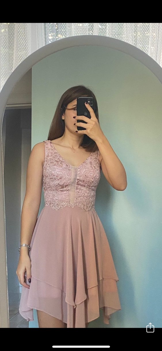 Pembe renkli, V yaka ve kolsuz kesime sahip, nakışlı dantel detaylarıyla süslenmiş, vücuda oturan mini boy abiye elbise. Düğünler için uygun. etiketi yok ama daha önce hic giyilmedi Gögüsünde ped var