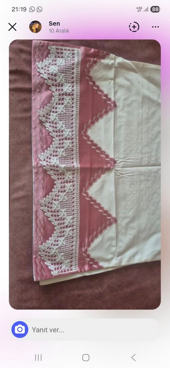 Pastel pembe renkte, kenarlarında nakışlı detaylar bulunan klasik tarzda masa örtüsü.