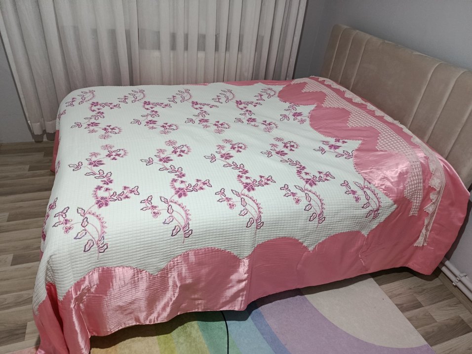 Bu yatak örtüsü, beyaz zemin üzerine pastel pembe nakışlar ve yumuşak pembe bir bordür içerir. Yataklara zarif bir dokunuş katar. ️