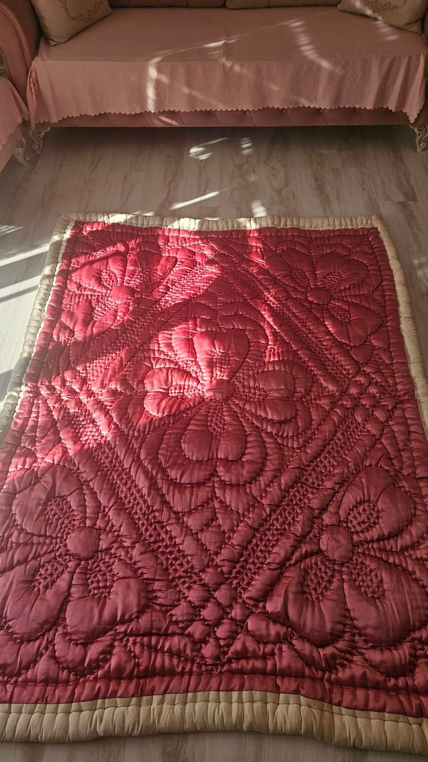 pembe renkte, zarif nakışlı çiçek desenlerine sahip, odanıza dokulu ve sıcaklık katan yatak örtüsü.