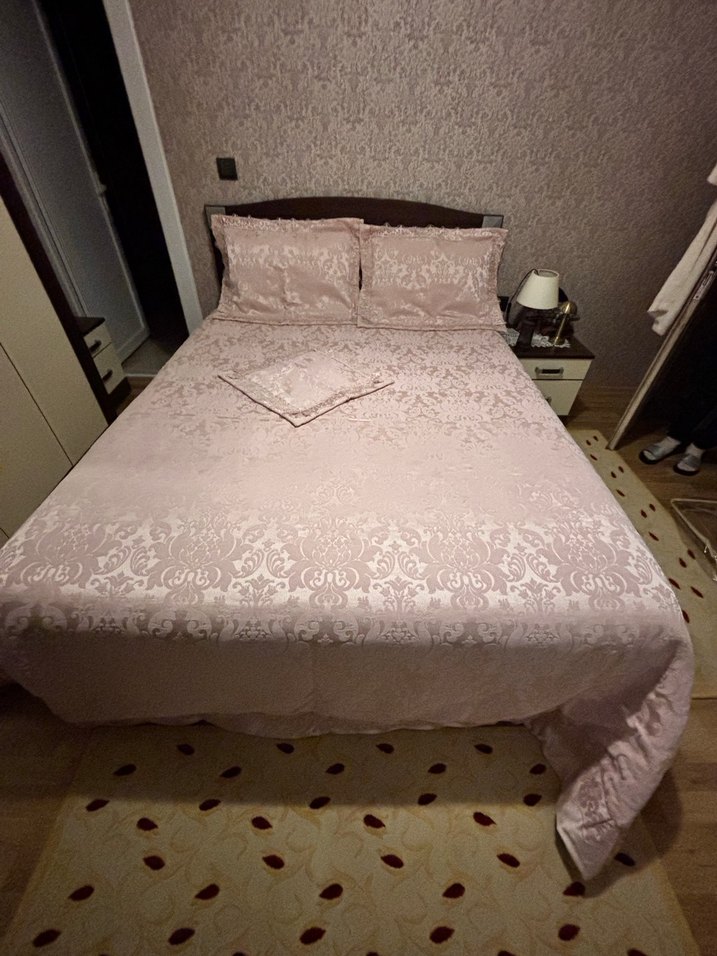 Pastel pembe renkli, zarif nakış desenlerine sahip yatak örtüsü takımı. Yumuşak ve şık tasarımıyla rahat bir uyku ortamı sağlar.