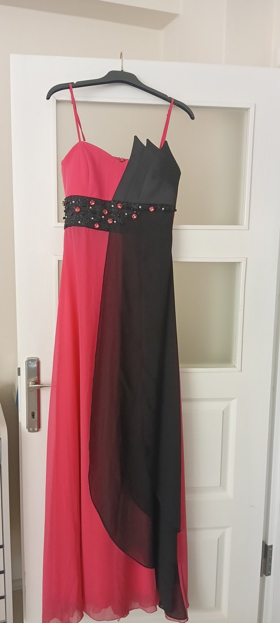İnce askılı, straplez yaka ve drapeli kesime sahip, pembe/narçiçeği ve siyah renklerde nakış detaylı, uzun ve vücuda oturan kadın abiye elbisesi. Bir gece giydim. Kuru temizleme yapılmadı. herhangi bir leke vs yok.