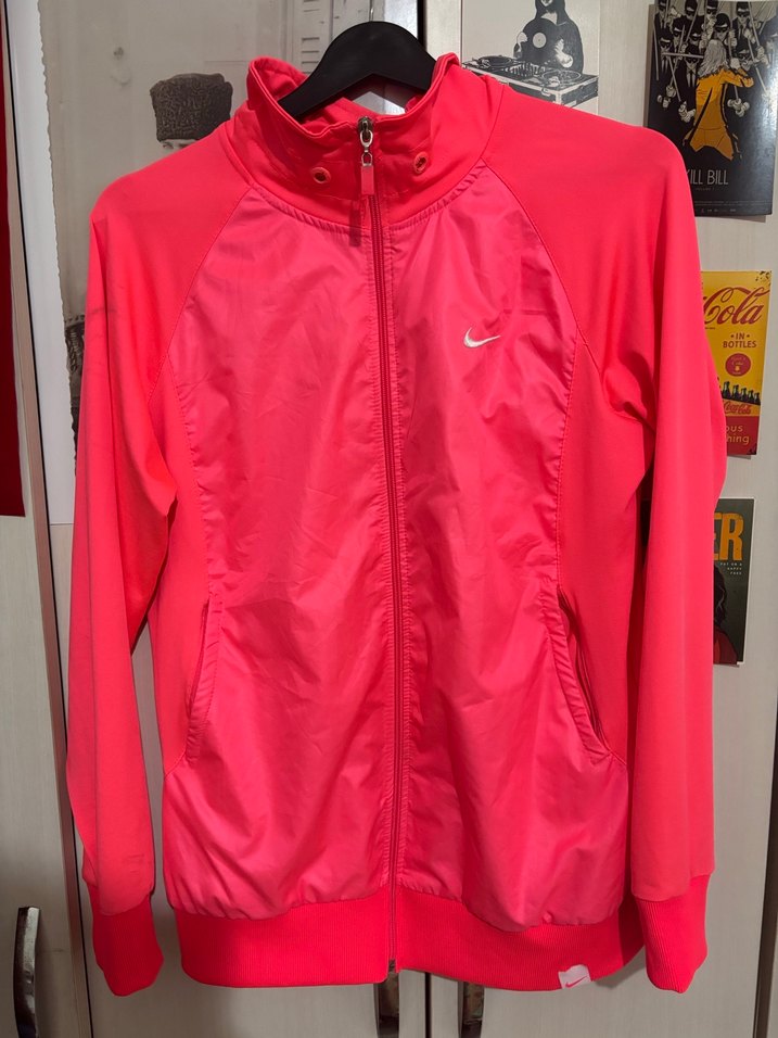 Fermuarlı cepleri ve parlak pembesiyle, yüksek yakalı ve uzun kollu, spor şıklığında Nike kadın ceketi.